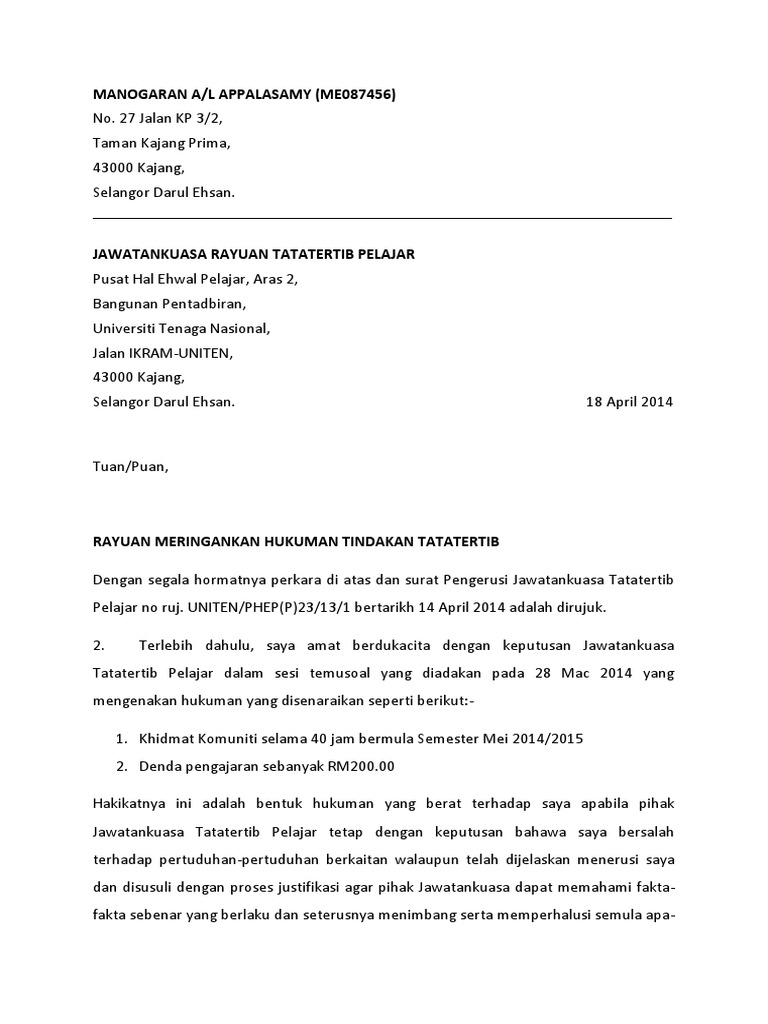 Contoh surat rasmi rayuan tindakan tatatertib. SMKT030303SLT Tarikh. Pengesahan bebas tindakan tatatertib oleh suruhanjaya.